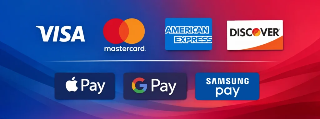 We accept most common payment types including credit or debit cards, Apple Pay®, Google Pay™ and Samsung Pay.